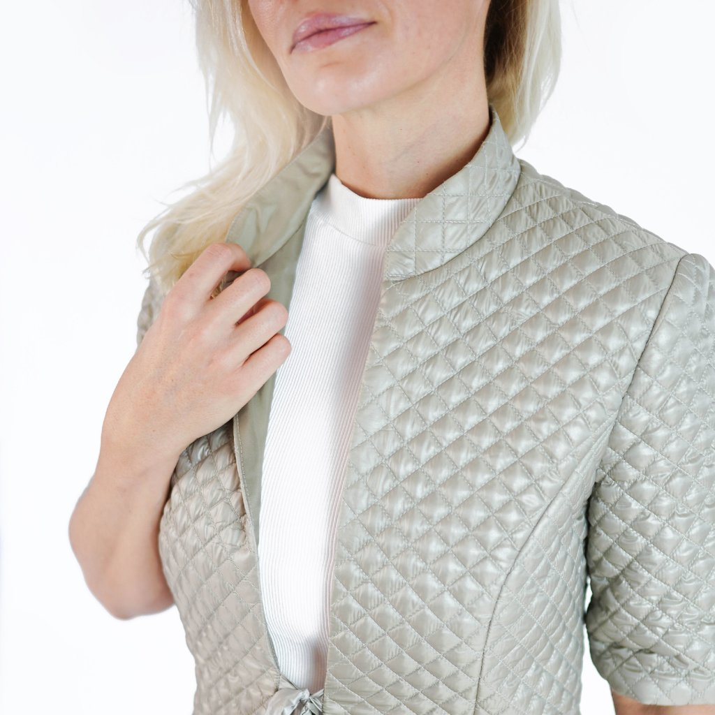 Velmi lehký dámský kabátek ušitý z prošívané šusťákoviny dle vlastního návrhu s mělkými kapsami a prodlouženými rukávy. Zavazování na stuhu.