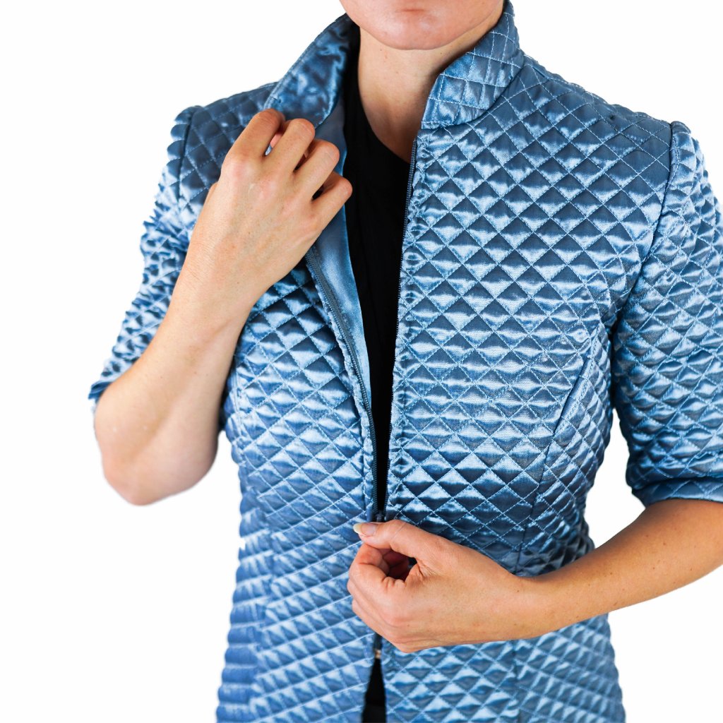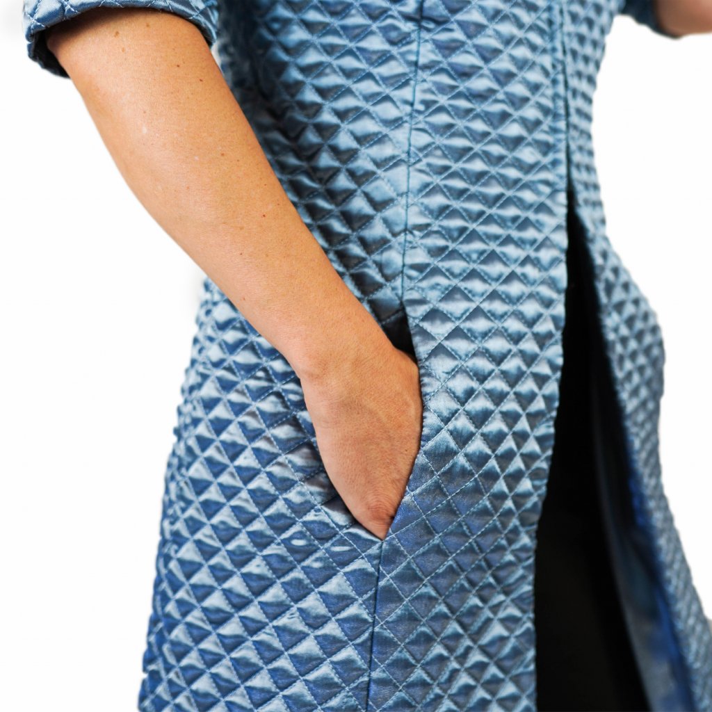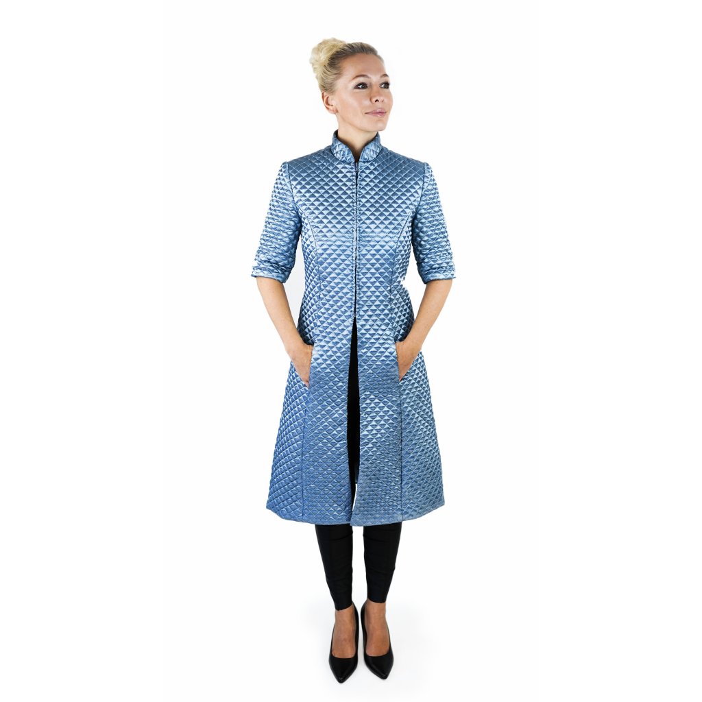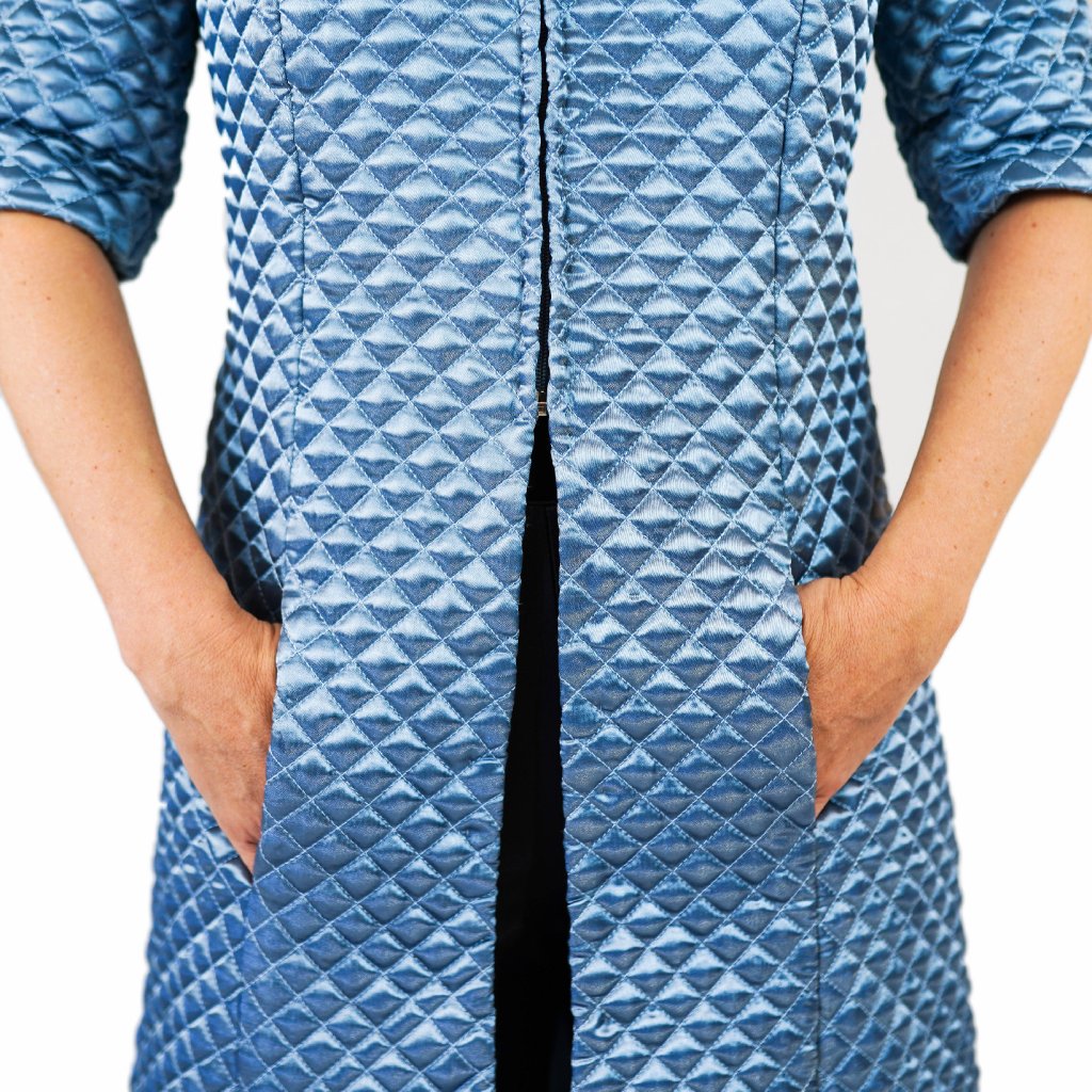 Efektní dámský kabát ušitý z prošívaného saténu dle vlastního návrhu s hlubokými kapsami se zapínáním na zip, se stojáčkem.